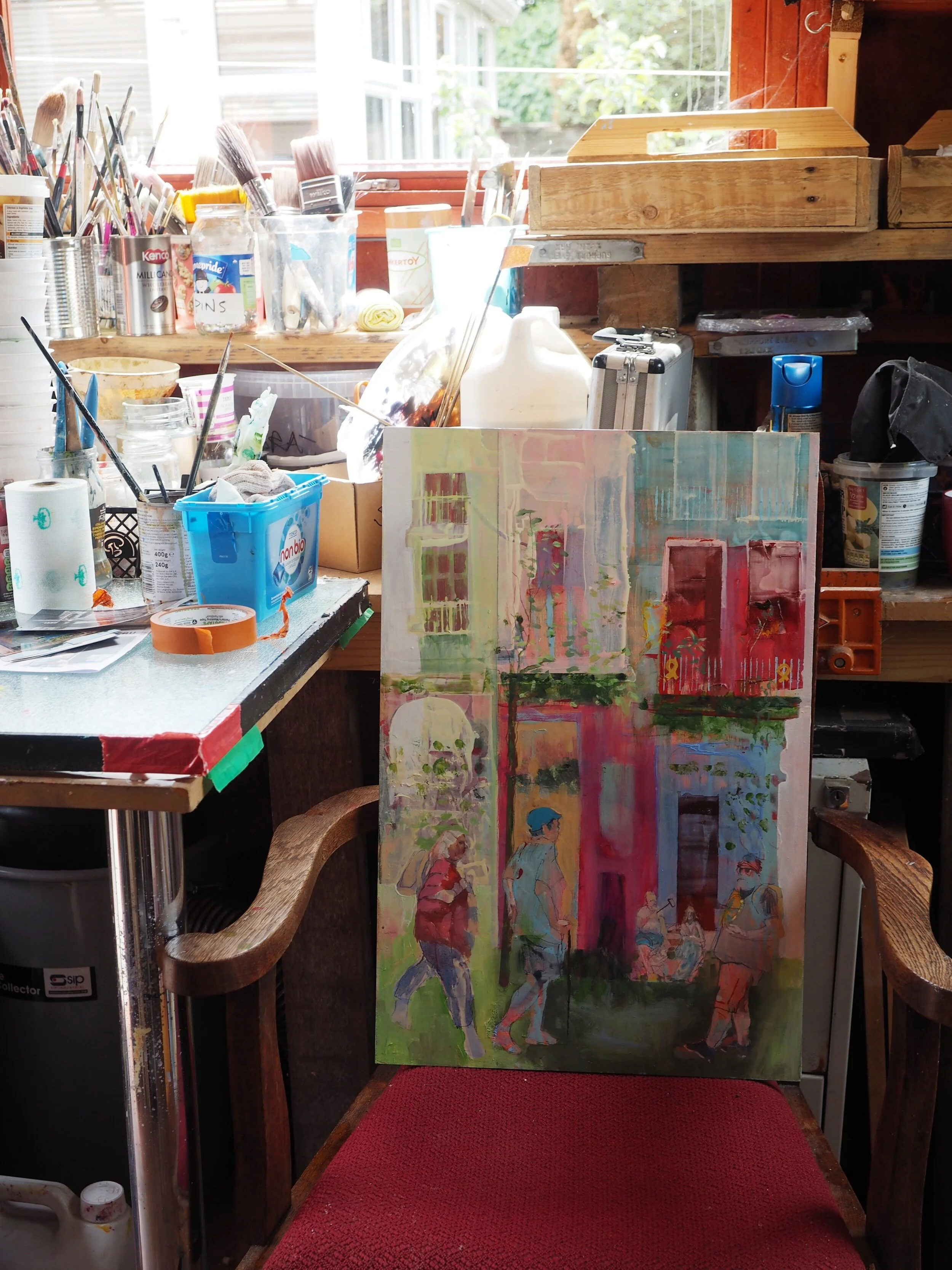 I’m exploring the shimmering interplay between figures and buildings and balconies in this short series of work. The visual ‘stew’ of locals, tourists walking, often framed by the architecture interests me. Sudden glimpses and ‘peeps’ into windows and doorways, whilst lots of things go quite unnoticed above their heads.